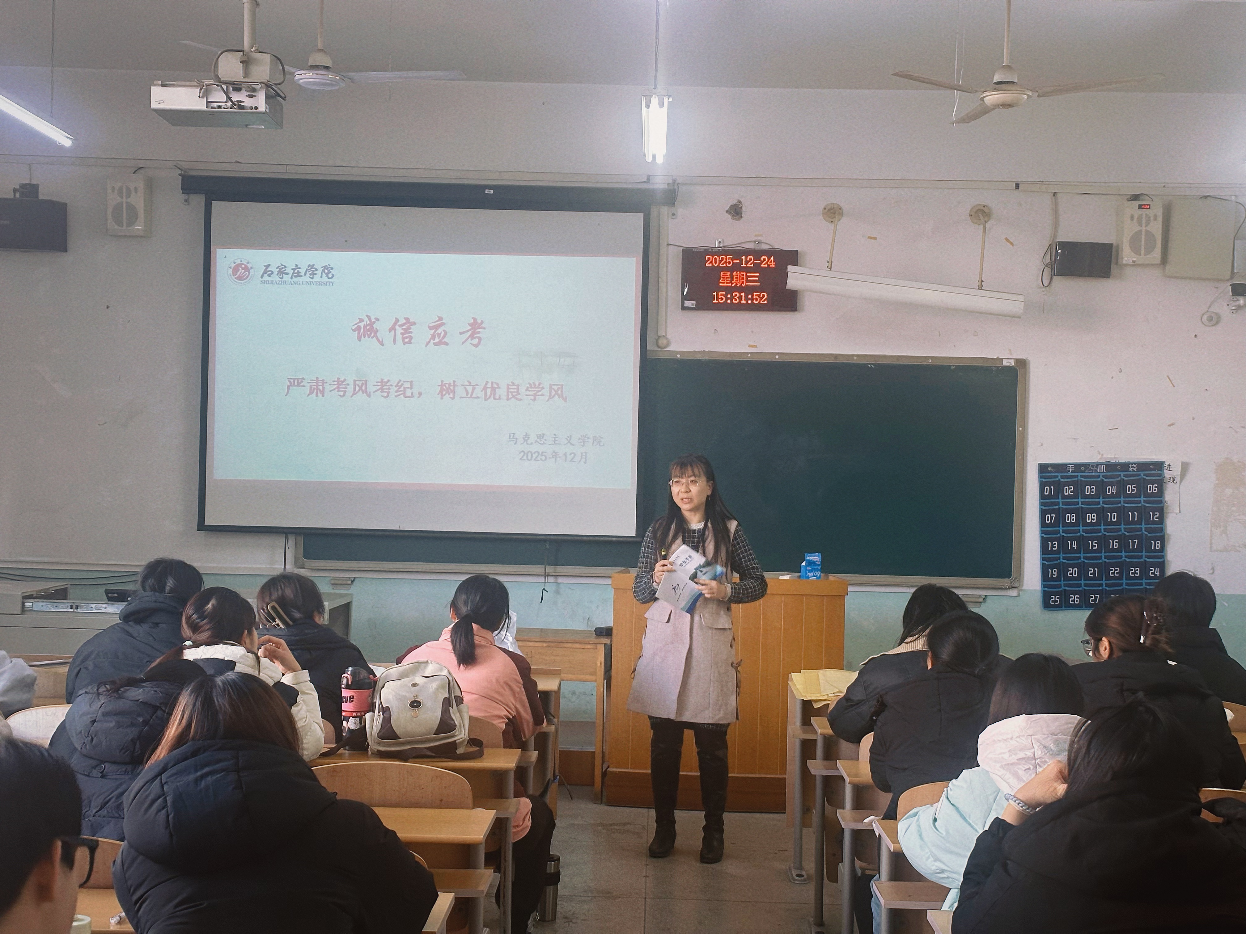 针对首次参加大学期末考试的2025级新生,学院注重教育引导与人文关怀并重。新生辅导员张琳琳为全体新生召开线下主题班会。她从调整备考心态、掌握复习方法等方面与新生深入交流,详细讲解考试规则与注意事项,提供针对性学习建议,帮助新生缓解压力、增强信心,鼓励他们以扎实的学识和端正的态度迈好大学诚信应考的第一步